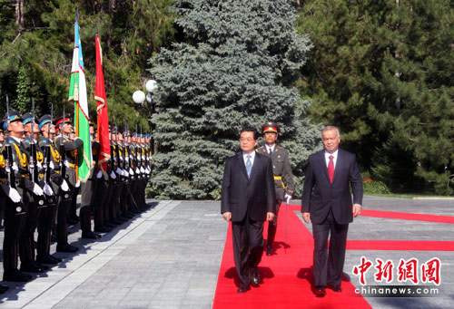 中国国家主席胡锦涛9日抵达乌兹别克斯坦首都塔什干。这是胡锦涛时隔6年再次对乌兹别克斯坦进行国事访问。当天下午,乌兹别克斯坦总统卡里莫夫在国宾馆举行仪式,欢迎胡锦涛到访。