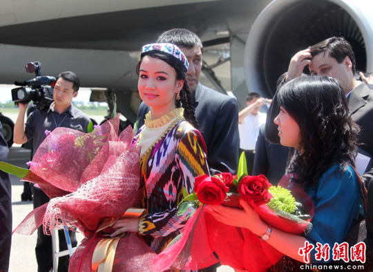 中国国家主席胡锦涛当地时间9日中午抵达乌兹别克斯坦首都塔什干,受到乌方热烈欢迎。乌兹别克斯坦政府多位高级官员到机场迎接,身着民族服装的乌兹别克斯坦姑娘(左)前来献花。中新社发 张朔 摄