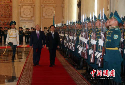 当地时间12日上午,中国国家主席胡锦涛在阿斯塔纳同哈萨克斯坦总统纳扎尔巴耶夫举行会谈。这是胡锦涛第六次访问哈萨克斯坦,受到哈方隆重欢迎。图为会谈前,纳扎尔巴耶夫在总统府内举行仪式,迎接胡锦涛到访。