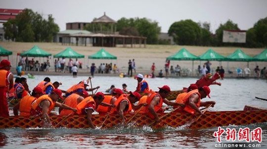 “泛舟博斯腾,玩转金沙滩”大型龙舟赛14日在新疆博斯腾湖金沙滩景区举行,以此庆祝中国传统节日——端午节。中新社发 马卫平 摄