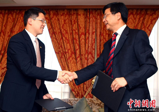 6月17日,中国新闻社社长刘北宪(右)在台北与旺旺中时媒体集团总经理蔡绍中签署框架合作意向书,加强双方在各项新闻业务方面的合作,努力拓展合作空间,共同推动两岸新闻交流,促进两岸关系发展。双方同意在新闻通稿、图片、视频、网络、杂志等领域常态性交换内容;同意在两岸共同举办各类文化、经贸交流活动;中新社经常性地向中时集团提供介绍大陆的专题资讯,努力拓展合作空间。中新社发 宋吉河 摄