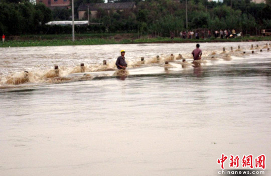 6月18日傍晚,龙游小南海镇定埠村4名村民过桥时因突发洪水,两人被围困河中,两人被河水冲走。中新社发 江耘 摄