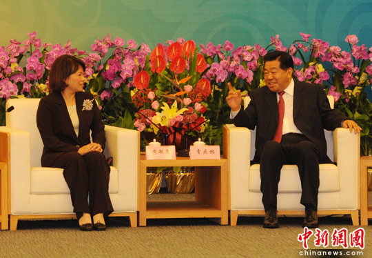 6月19日下午,中共中央政治局常委、全国政协主席贾庆林(右)在厦门会见前来参加第二届海峡论坛的台湾嘉宾代表并与中国国民党副主席黄敏惠(左)亲切交谈。中新社发 刘可耕 摄