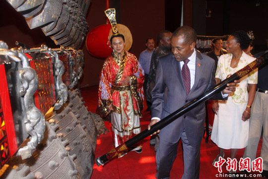 6月19日,莫桑比克总理阿里一行抵达湖北访问。当日下午,阿里赴湖北省博物馆参观,并欣赏了编钟专场演奏。图为演出结束后,阿里总理亲手演奏编钟。中新社发 艾启平 摄