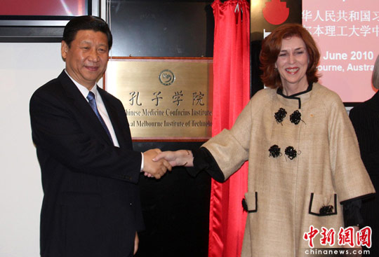 当地时间6月20日上午,正在澳大利亚墨尔本访问的中国国家副主席习近平出席了皇家墨尔本理工大学中医孔子学院揭幕仪式。图为习近平与皇家墨尔本理工大学校长亲切握手。中新社发 余湛奕 摄