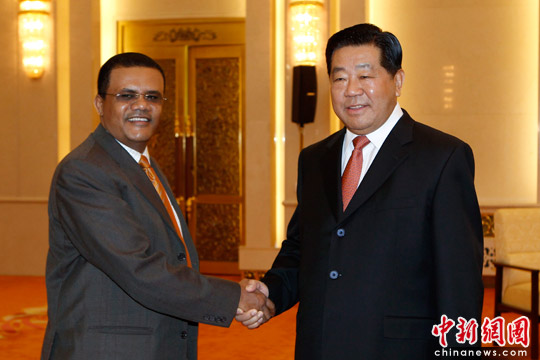 6月22日,中国全国政协主席贾庆林在北京人民大会堂会见了埃塞俄比亚联邦民主共和国联邦院议长德格菲。中新社发 盛佳鹏 摄