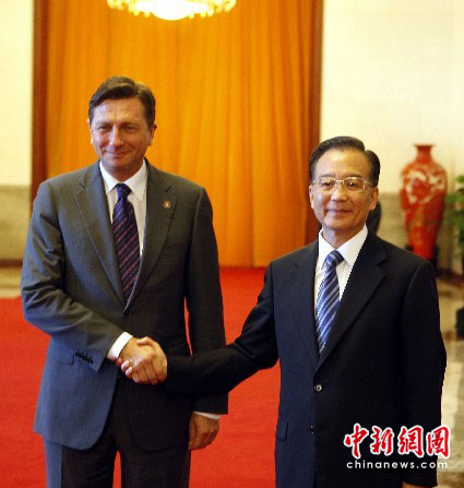 6月23日,中国国务院总理温家宝在北京人民大会堂会见斯洛文尼亚总理帕霍尔。中新社发 任海霞 摄