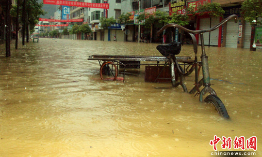 6月28日,广西河池市凤山县遭受特大暴雨袭击,倾盆而下的大雨迅速引发城区严重内涝,县内四条主街道全部被洪水淹没,水位最深处已没过人身。中新社发 李勤政 摄