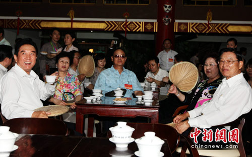 6月28日下午,来渝进行两岸两会领导人第五次会谈的海协会会长陈云林和海基会董事长江丙坤一行,在重庆千年古镇磁器口一家老茶馆内喝茶听民乐,感受老重庆风情。中新社发 郭晋嘉 摄