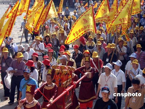 5月15日下午,360名台湾妈祖信众进香团成员步行前往莆田湄洲岛妈祖祖庙谒祖进香。当日,搭载他们的“海洋拉拉号”客货轮从台湾台中直航抵达福建湄洲港客运码头,实现台中港与湄洲港首次客运直航。中新社发 刘可耕 摄