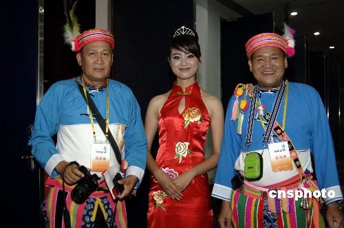 5月16日晚,在厦门参加首届海峡论坛的台湾原住民与现场穿着旗袍的礼仪小姐合影留念。中新社发 王东明 摄