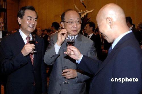 5月17日中午,中共中央台办、国务院台办主任王毅在厦门举办酒会招待参加海峡论坛的台湾嘉宾。图为王毅(左一)与台中市长胡志强(中)、民进党前主席许信良(右一)在酒会上相谈甚欢。中新社发 王东明 摄