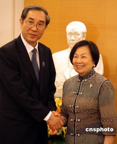 广西壮族自治区主席马飚五月二十一日率领广西经贸文化代表团乘坐包机飞抵台湾,他是大陆第一个率团赴台进行经贸文化交流的正省长,此行是海峡两岸交流史上的新突破。图为马飚主席(左)二十一日抵达台湾后,从机场直接来到台泥大楼,拜会已故辜振甫先生的遗孀辜俨倬云女士。中新社发 耿军 摄