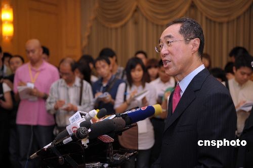 六月二日,香港政务司司长唐英年率团访问深圳,在回答媒体记者时表示:深港两地将加快港珠澳大桥、莲塘口岸、机场铁路、文化创意产业等方面的合作,做到功能互补、错位发展。中新社发 陈文 摄