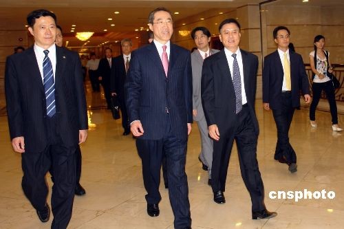 6月5日,香港特别行政区政务司司长唐英年率五十余人组成的香港政府及工商界代表团访问广东江门,与江门市委书记陈继兴、市长王南健等市领导举行座谈会,共同探讨江港两地在新形势下加强合作的前景。据悉,江门是继广州、佛山和深圳后,香港代表团巡访考察珠三角九城市的第四站。中新社发 李健群 摄