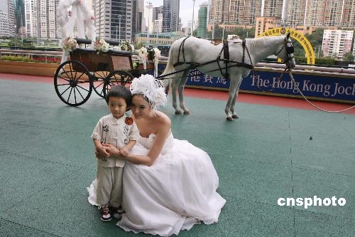六月十四日,第一次随家长来香港跑马地马场参观的三龄童叶柏希小朋友,今天尤感喜气洋洋。不仅观看到平时难得一见的古典婚庆马车,还巧遇在现场的香港影视明星、著名模特Ana.R小姐。因应民众消费需求,向来仅接待会员的跑马地马场,当日,首次举行“香港赛马会婚宴展览”。中新社发 郑祚声 摄