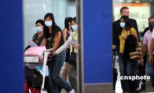 连日来,香港H1N1流感病例继续增加,确诊个案已突破一百宗。六月十五日,香港卫生防护中心总监曾浩辉表示,H1N1流感已跨区存在,相信其它区域也会出现个案,现时的个案属冰山一角,相信一两周,会有双位增长。图为抵港的旅客戴上口罩预防感染。中新社发 洪少葵 摄