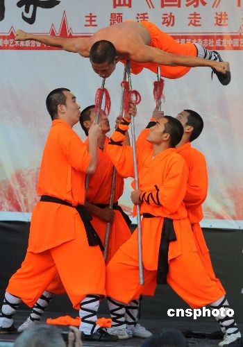 当地时间6月22日晚,洛杉矶华埠举行主旋律歌曲《国家》走进美国华人社区主题活动,成龙亲自为现场观众献唱歌曲《国家》。当地艺人表演了中国传统武术等节目。图为洛杉矶华埠少林武僧表演硬气功。中新社发 张炜 摄