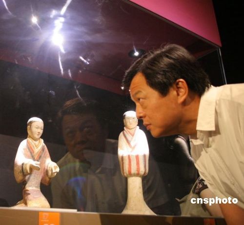 6月27日,“微笑彩俑—汉景帝的地下王国”特展在台北历史博物馆正式开展,首日即出现人潮。图为一向对雕塑艺术有兴趣的台北县长周锡玮,在专注观赏塑衣式彩绘跽坐拱手女俑。中新社发 董会峰 摄