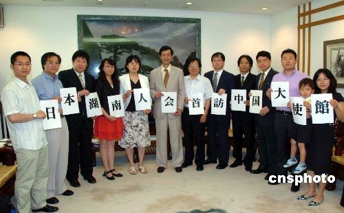 中国驻日大使馆许泽友参赞兼总领事,7月2日下午在大使馆会见了日本湖南之友会共同代表、日本湖南人会会长段跃中一行,并和日本湖南人会的副会长、理事们进行了一个小时的座谈。许泽友说,湖南有很深的文化底蕴,又有丰富的资源,发展潜力很大。期待在日湖南人为促进家乡、祖国与日本的交流方面起桥梁和窗口的作用。图为日本湖南人会理事和许泽友总领事(左六)、刘敬师领事(右四)合影。中新社发 段跃中 摄