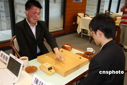 7月2日,第二届“棋王赛”七番棋挑战赛在台北海峰棋院进行,此前三连败的台湾“红面棋王”周俊勋九段(左),刻意换平日不惯用的左手对弈,最后竟幸运以半目胜出,避免了被零封的尴尬。周俊勋的此胜,也中止了挑战者陈诗渊(右)自循环圈赛以来的10连胜。中新社发 董会峰 摄