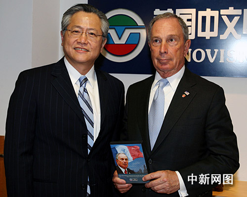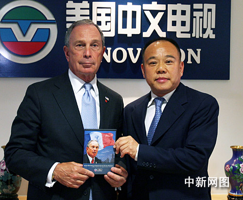 当地时间7月8日,纽约市长彭博亲自走访了位于曼哈顿的美国中文电视总部,为其争取第三次市长连任寻求华裔支持。图为彭博(左)与美国中文电视董事长岑工(右)合影。