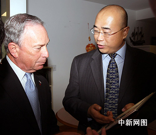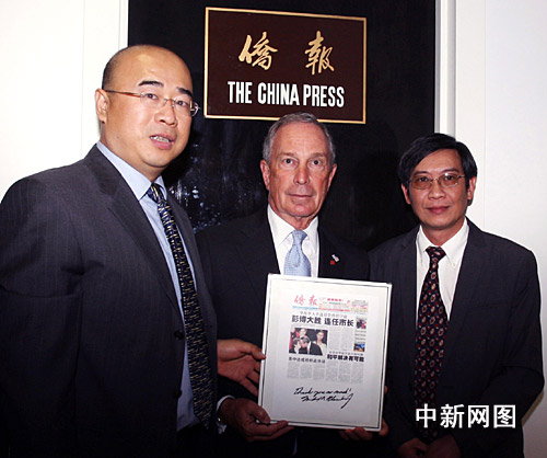 当地时间7月8日,纽约市长彭博亲自走访了位于曼哈顿的侨报,为其争取第三次市长连任寻求华裔支持。图为彭博与侨报总裁李冰(右)在一起。