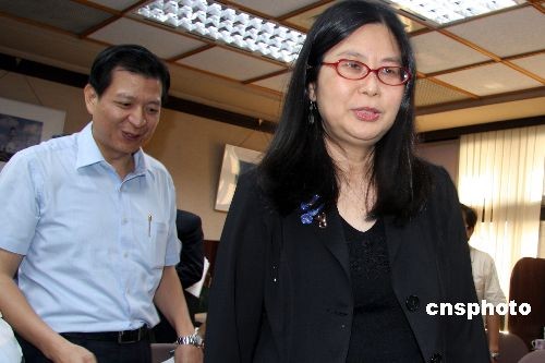 7月9日下午,近日受到感冒困扰的台湾“陆委会”主委赖幸媛(右),出席“关怀大陆配偶”网站专区启用记者会,她希望台湾社会体会“牵手”精神,展现包容与宽容,一步步消弭对大陆配偶及外籍配偶一定程度的成见。中新社发 董会峰 摄