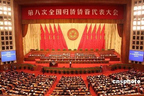 7月14日,第八次全国归侨侨眷代表大会开幕式在北京人民大会堂隆重举行,胡锦涛等党和国家领导人到会祝贺。全国千余名归侨侨眷代表和海外侨胞齐聚一堂,回顾总结“七代会”以来的工作,研究部署未来五年的工作任务,修改中国侨联章程,选举产生中国侨联新的领导集体,表彰全国侨界“十杰”等侨界先进集体和先进个人,开创侨联工作的新局面。中新社发 史利 摄