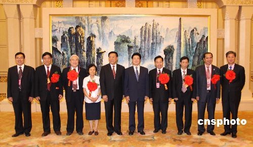 7月14日,全国“侨界十杰”在北京人民大会与全国人大常委会副委员长王兆国、中国侨联主席林军合影。当日,全国“侨界十杰”评选产生,获选的是:北京华腾东光科技发展有限公司高级工程师罗益锋,吉林大学汽车学院教授郭孔辉,福建省光学技术研究所高级工程师赖爱光,中国科学院海洋研究所研究员郑守仪,广东韶关钢铁集团有限公司主任工程师、高级技师罗东元,海南省农垦总局副局长、南田农场场长彭隆荣,中国科学院院士、世界著名数学家吴文俊,国家体育总局体操中心副主任、国家级教练黄玉斌,中国航空工业集团公司北京航空材料研究院高级顾问颜鸣皋,神华集团有限公司总经理张玉卓。中新社发 史利 摄