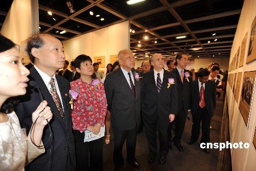 七月二十日傍晚,“中美建交三十周年图片展”在香港开幕。全国政协副主席董建华(左四)、香港特区政府司长唐英年(右二)、外交部驻港特派员公署署理特派员詹永新(左二)、中国人民对外友协副会长李小林女士(左三)、美国驻香港总领事唐若文(右三)等贵宾出席并观看展览。中新社发 郑祚声 摄