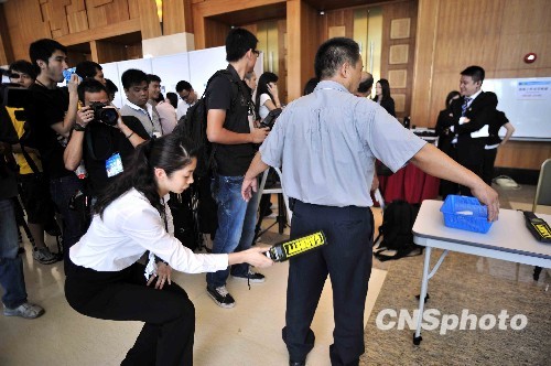 澳门特别行政区第三届行政长官选举二十六日举行。图为媒体记者入场前进行安全检查。中新社发 谭达明 摄