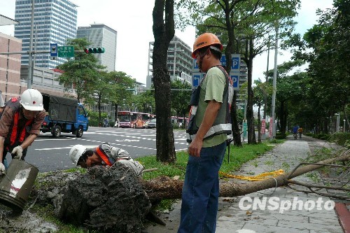 8月8日上午,环卫工人利用雨歇间隙,在台北街头清理被拔根而起的路树。8月7日23时50分,行踪诡异的“莫拉克”台风从花莲登陆,持续为台湾各地带来狂风暴雨。据官方统计,台风已对道路、农业、树木、电力等产生严重冲击,造成数人死亡、数十人受伤。中新社发 董会峰 摄