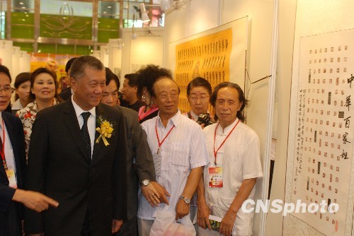 由《澳门月刊》主办,中国新闻社、澳门民政总署协办的庆祝国庆六十周年暨澳门回归十周年系列活动八月十二日在澳门综艺馆开幕,图为澳门特区行政长官何厚铧参观图片书画展。中新社发 毕永光 摄