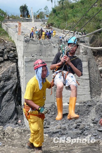 8月14日下午,在新发村与上游新开部落之间道路崩塌处,少年周瑞期到新开确认遇难爷爷遗体后离开部落。图为苗栗县救难协会成员在吊挂处迎接周瑞期安全返回。新发村在“莫拉克”台风侵袭期间有32人于突发泥石流灾难中身亡。中新社发 刘舒凌 摄