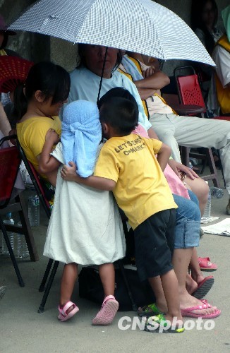 8月16日,高雄县旗山中学操场在持续从灾区疏散村民。图为高山村落的一家人顶着烈日等候家人抵达。中新社发 刘舒凌 摄