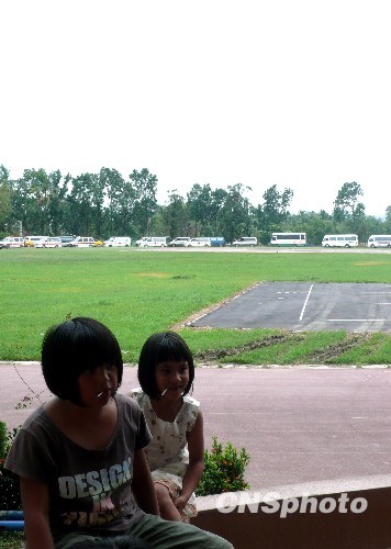 8月16日,两名高山村落的儿童在高雄县旗山中学操场隔离区之外玩耍,远处跑道上停满待命救援车辆。“莫拉克”台风后高山地区居民疏散工作正在这里进行,长辈忧心未来,孩子们缺少陪伴照料。中新社发 刘舒凌 摄