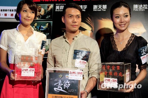 台湾灾情牵动着香港各界人士的心,八月十九日,由无线电视首次推出的电影《LAUGHINGGOR之变节》响应“恶水无情.人间有情 台湾8.8赈灾大行动”巡回募捐。图为香港艺人谢天华、周美欣、叶翠翠出席募捐活动。中新社发 张勤 摄