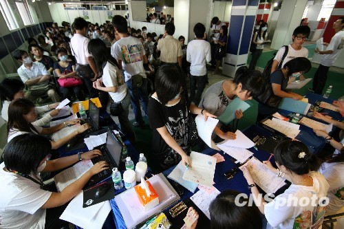 在马会天水围电话投注中心九月全面落成及新马季开锣之前,香港赛马会招聘一千八百个兼职空缺面试会,八月二十二日在天水围举行。从二万九千名报名求职者中预约而来面试的二千八百多名申请人,正在招聘现场递交登记表,应征者即场获知面试结果,入选者会被安排培训。天水围位于香港新界元朗区,区内三十万居民多为劳工阶层。为加快当地发展,香港赛马会将新的电话投注中心及培训中心设在天水围,提升当地就业率为社会经济注入活力。中新社发 郑祚声 摄