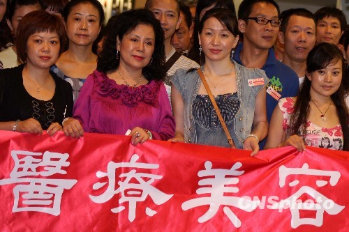 8月25日晚,中国大陆医疗美容百人首发团抵达台北,展开为期6天的医美、观展、观光、开会“四合一”体验行程。前排左二为团长、广州最佳女主角美容美体集团董事长林彩霞。中新社发 董会峰 摄