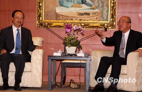 8月26日上午八时,中国国民党主席吴伯雄在台北会见中国移动董事长王建宙,特别对大陆官方、民间对台湾“88水灾”的无私援助表示感谢,他称大陆各项捐款已近40亿元新台币。中新社发 董会峰 摄