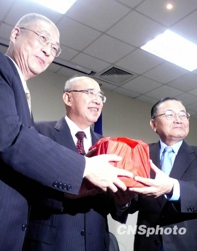 中国国民党中常会9月9日下午讨论通过,副主席詹春柏即日起兼任国民党中央委员会秘书长一职。图为詹春柏(右)与即将出任“行政院长”的国民党前任秘书长吴敦义交接印信。中新社发 刘舒凌 摄