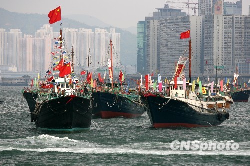 九月二十日,香港离岛区举办“欢庆中华人民共和国成立六十周年-海陆巡游大汇演”。是次活动是离岛区历来规模最大的海陆巡游活动,共分为海上巡游、陆上巡游及国庆大汇演三部分。活动吸引一万五千名市民参与及观赏,场面相当热烈。图为海上巡游出发仪式在尖沙咀海傍星光大道隆重举行,共六十艘特色船只参加巡游。中新社发 张勤 摄