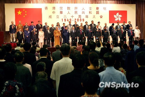 九月二十二日晚,香港特区行政长官曾荫权、中联办主任彭清华、特区民政事务局局长曾德成等嘉宾在尖沙咀,出席香港宗教界人士庆祝中华人民共和国成立六十周年盛大集会。中新社发 郑祚声 摄