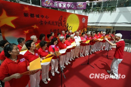 九月二十三日,六十位今年六十岁的香港长者聚会将军澳,庆祝国庆六十周年。这是他们在合唱《歌唱祖国》。中新社发 郑祚声 摄