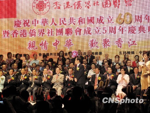 9月24日晚,香港侨界社团联会联同香港特区民政事务署在香港伊利沙伯体育馆举行庆祝中华人民共和国成立六十周年庆典晚会。特区行政长官曾荫权、中联办主任彭清华、外交部驻港公署特派员吕新华等莅临主礼。大会还邀请到内地部份省、市海外联谊会、侨务办公室及侨联等机构的领导专程来港出席晚会。香港特区政府官员、各国驻港总领事、社会名流、侨胞等共二千六百位嘉宾出席。中新社发 黎金良 摄