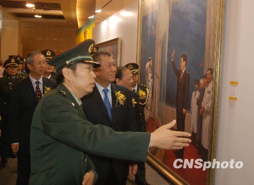 由中国人民解放军总政治部宣传部主办的《庆祝新中国成立六十周年暨澳门回归祖国十周年中国人民解放军美术书法精品展》,九月二十六日下午在澳门隆重开幕。这是中国人民解放军首次在澳门举办大型艺术展览交流活动。图为澳门特区行政长官何厚铧等参观展览。中新社发 毕永光 摄