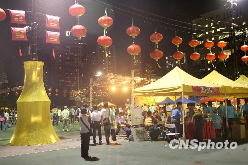 九月二十六日晚,香港维多利亚公园里大红灯笼高高挂,贺国庆迎中秋普天同庆的欢乐气氛十分浓烈。中新社发 郑祚声 摄