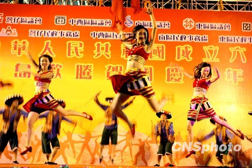 九月二十六日晚,香港维多利亚公园里一派欢腾,香港岛各界联合会及港岛各区议会等在这里联合举办“庆祝中华人民共和国成立六十周年港岛欢腾贺国庆嘉年华”。这是艺员在活动现场表演歌舞。中新社发 郑祚声 摄