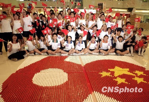 九月二十八日,香港举办“邮历60载——建政60周年珍邮展”。展出逾二百五十件珍贵历史邮品,让香港市民回顾新中国60年间的大事纪要。图为香港中学生以骨牌砌成巨型邮票,为“邮展”添趣。中新社发 张勤 摄